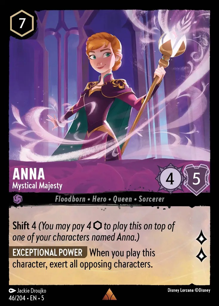 This is a good card for a princess deck. Shift 2 can be triggered at turn 2 and each time you play a princess you can reduce all Opposing character’s strength by 1. This makes challenging easier or vulnerable to effects like Under The Sea!