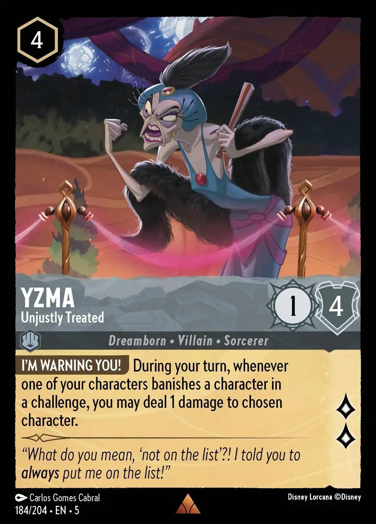 Yzma can fit in a Challenger deck as well. As they challenge and banish a character, Yzma can deal 1 damage which can help you target ready characters or make banishing much easier from challenges. Uninkable so 1 or 2 copies is enough.
