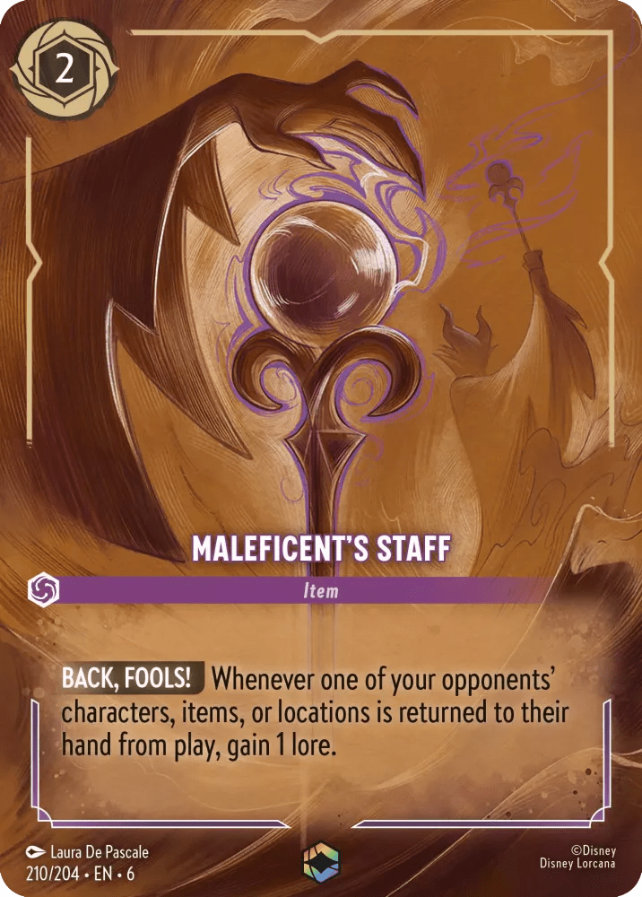 At first glance, it’s just the staff, but look closely, and you’ll notice Maleficent’s shadowy presence in the background. The art feels mysterious and elegant.